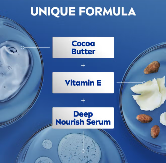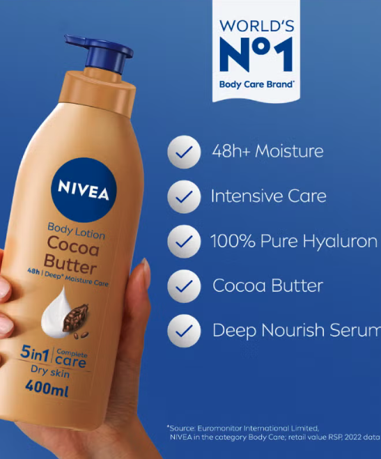 NIVEA Cocoa Butter Body Lotion is a creamy textured formula that instantly gives your skin sensational softness while enveloping your senses with an indulgent fragrance. Formulated with deep moisture serum, NIVEA Cocoa Butter Body Lotion is enriched nourishing cocoa butter & vitamin E that helps to lock in deep moisture for 48hours and give you noticeably smoother skin. NIVEA Cocoa Butter Body Lotion keeps away dullness to reveal glowing and beautiful skin all day long. At NIVEA we’ve got a vast selection of soaps, shower gels, bath additives, deodorants, creams, lotions, milks and a lot more. If you’re looking for products to help improve the healthy look or glow of your skin, we’ve got you covered! Take a look now and discover the ideal NIVEA product for your needs and preferences. We have products for both men and women including shaving items and deodorants for all of your personal hygiene requirements. NIVEA, a hundred years of skincare for life!