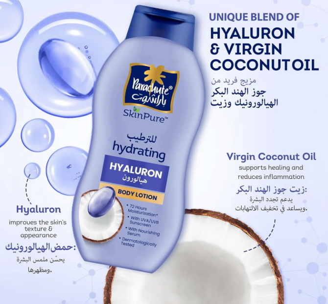 امنحي بشرتك ترطيباً عميقاً وحماية متكاملة مع لوشن باراشوت سكين بيور بالهيالورون وزيت جوز الهند البكر،